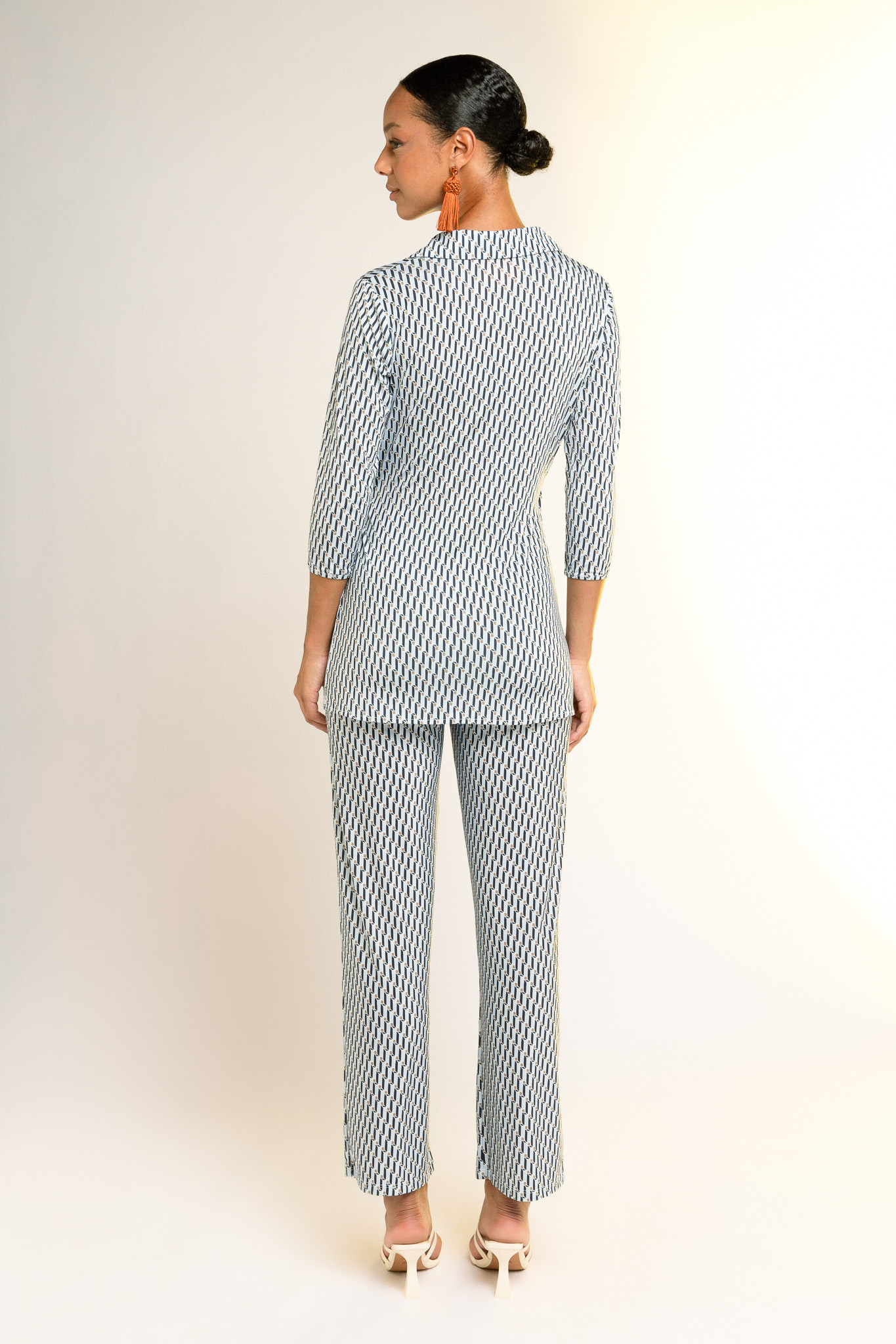 Camisa con nudo lateral. Cuello de camisa sin botones con escote en forma de V generado por el cierre cruzado. Mangas tres cuartos.