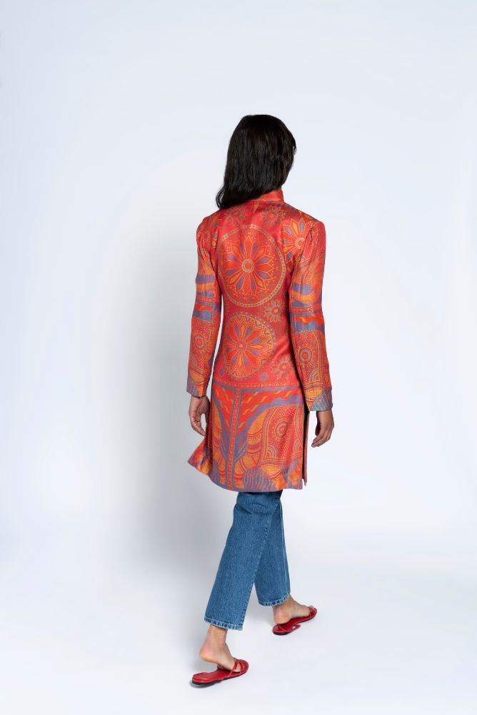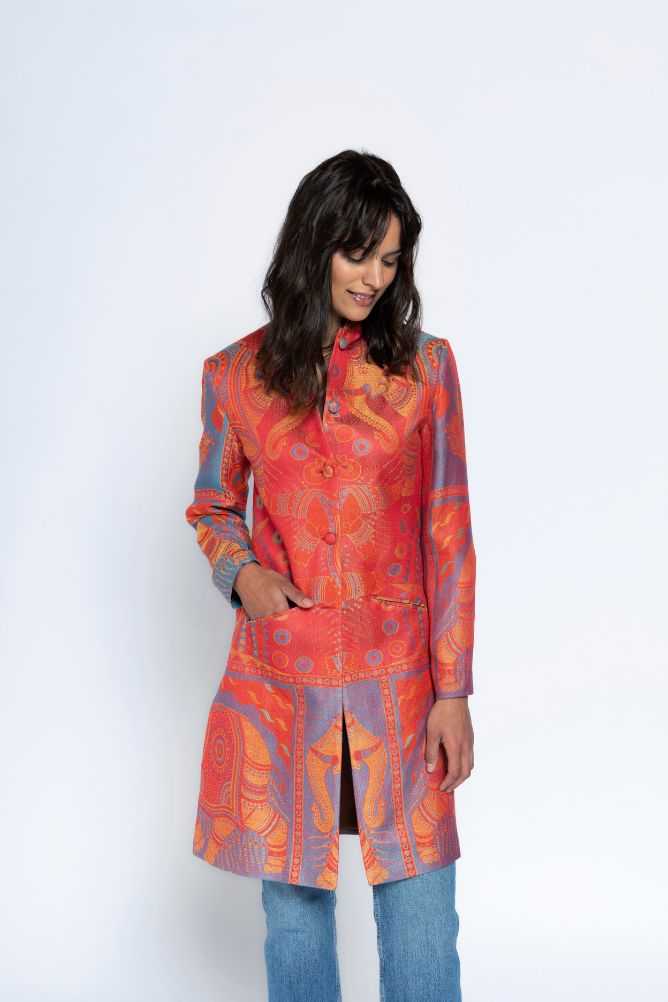 Chaqueta de tejidos de la India. Cuello alto y hombreras para estilizar la figura. Corte ajustado en la cintura y cierre con botones forrados en el mismo tejido en la parte central.