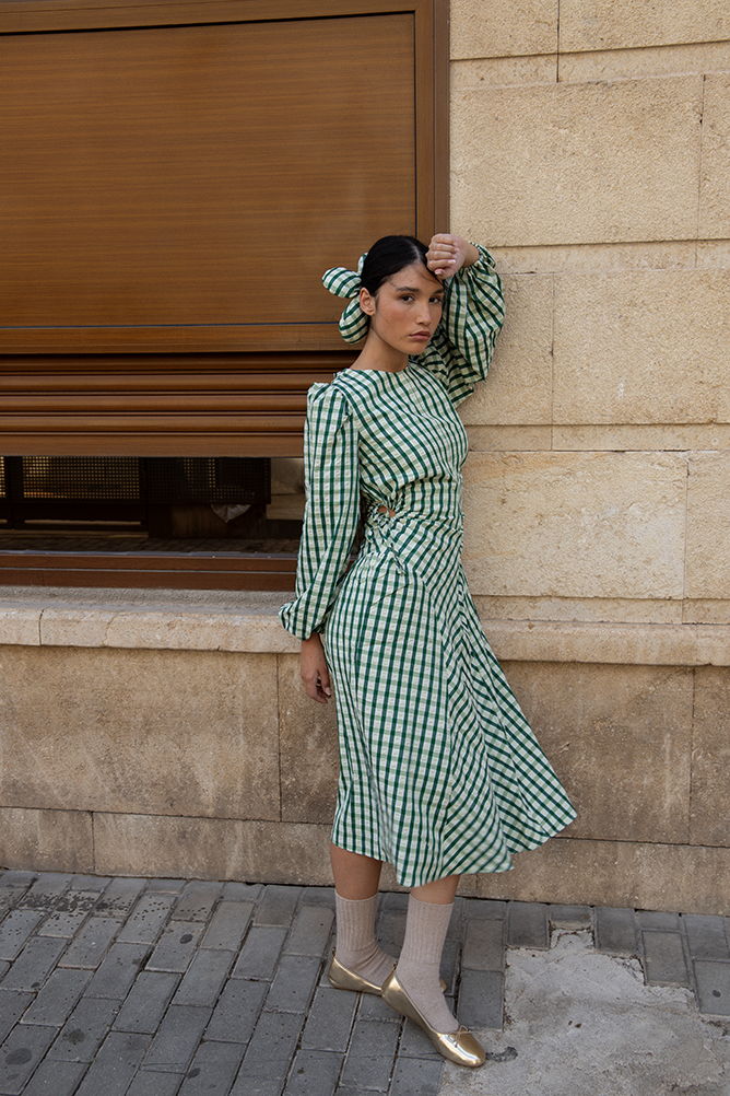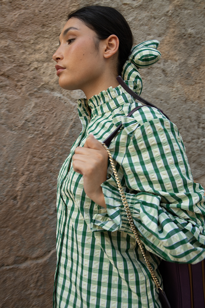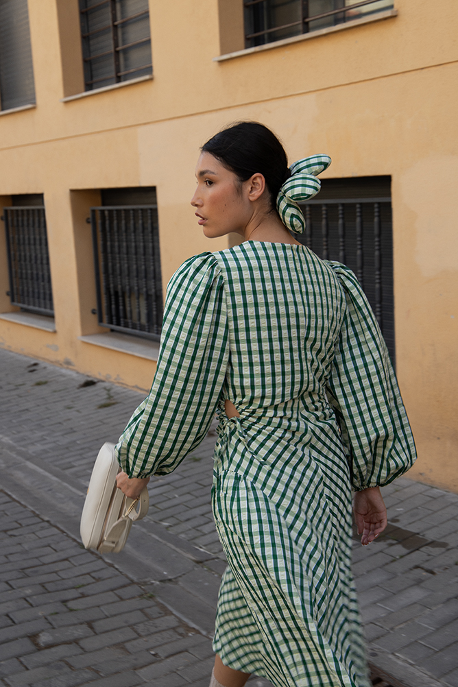 Coletero ajustable en forma de maxi flor con estampado vichy en verde y blanco.