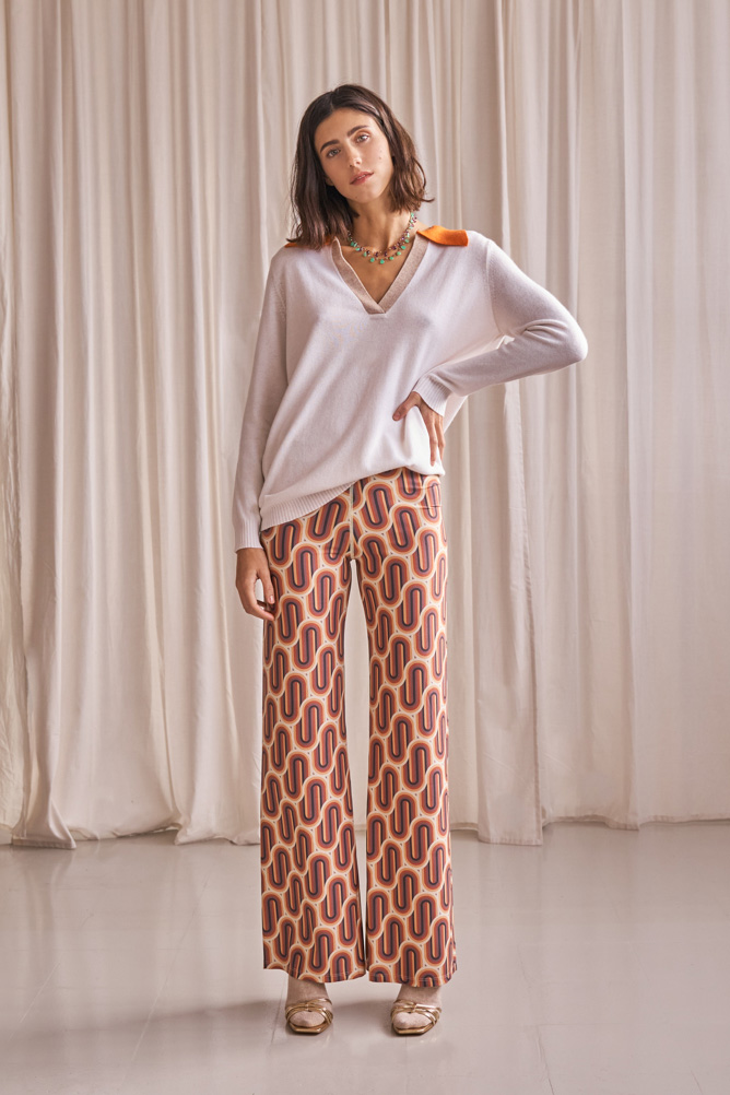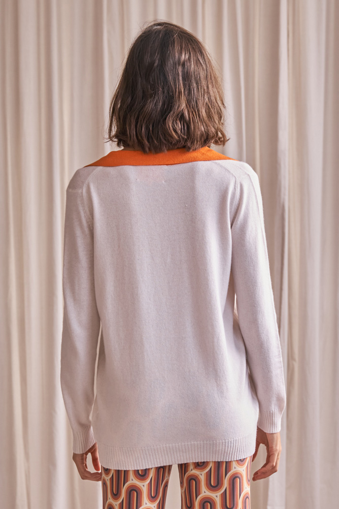Jersey crema de cashmere estilo oversize con escote de pico con terminaciones en puños y cintura en canalé. Cuenta con un ribete a contraste en el cuello de color beige y naranja.