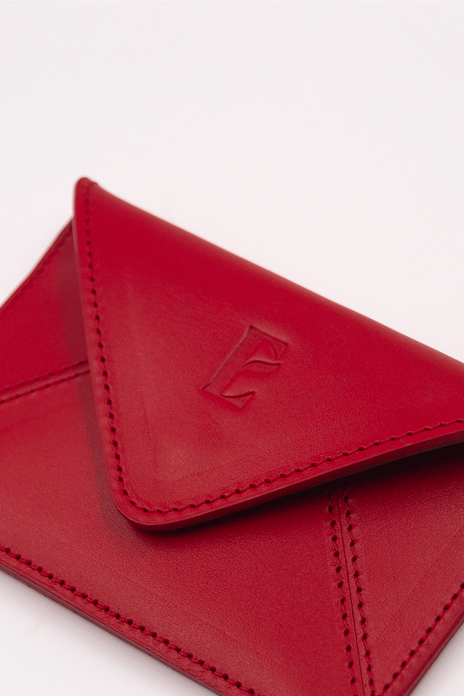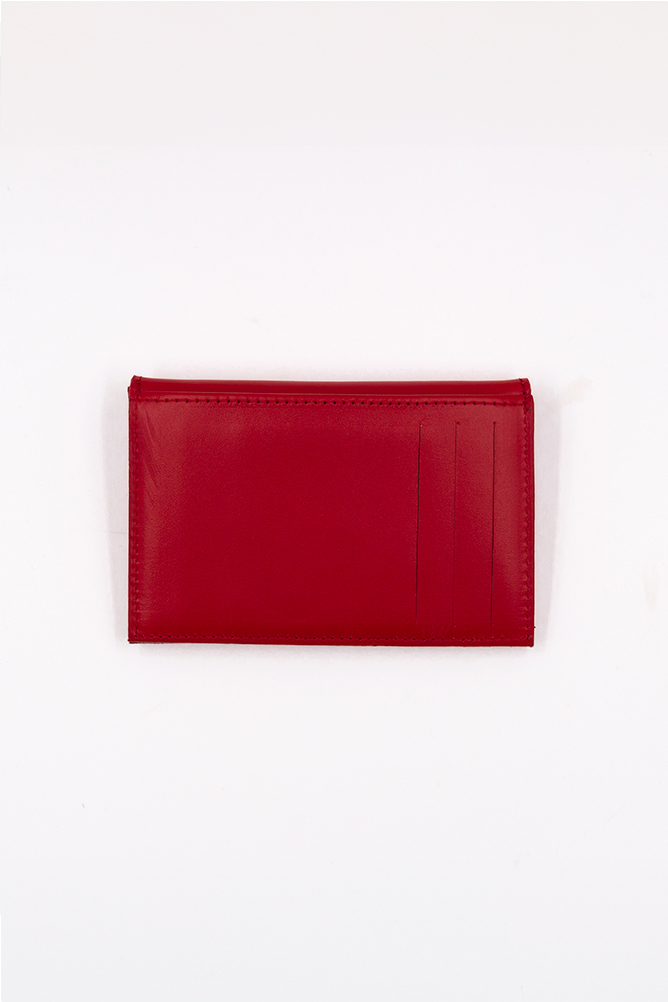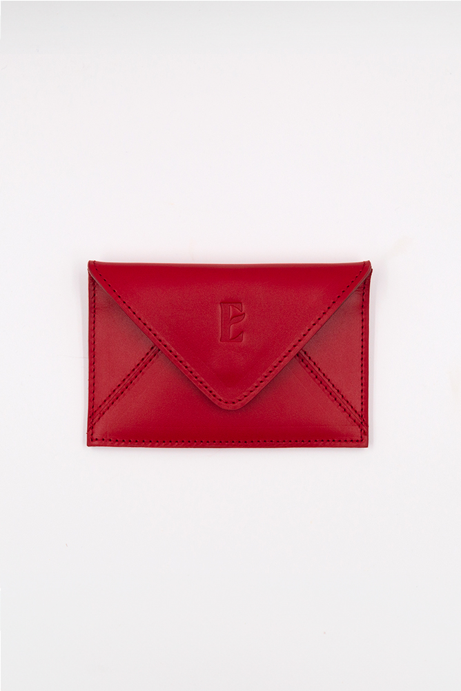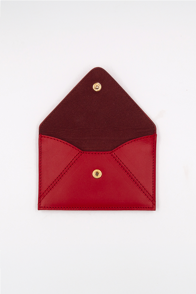 Monedero de piel producido en España. Abertura en forma de sobre con cierre de clip. Parte trasera con ranuras para portar tarjetas.