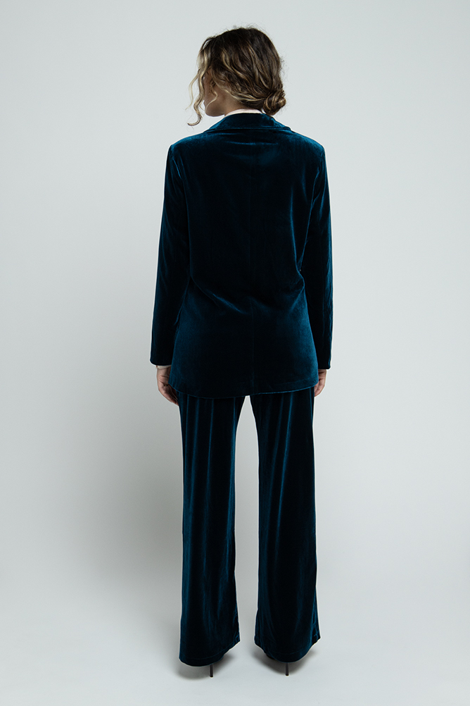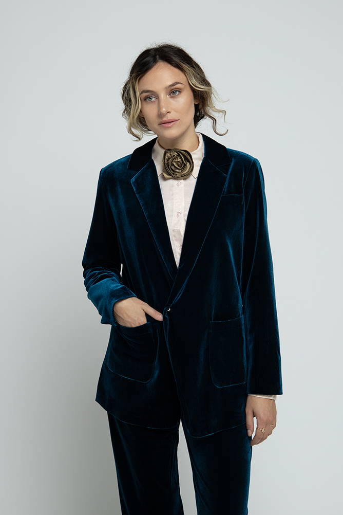 Americana cruzada de pana. Cuello de solapa que se cruza en la parte frontal con un botón interno. Cinturón del mismo tejido y color para anudar alrededor de la cintura con un nudo, ajustando la prenda y estilizando la figura.