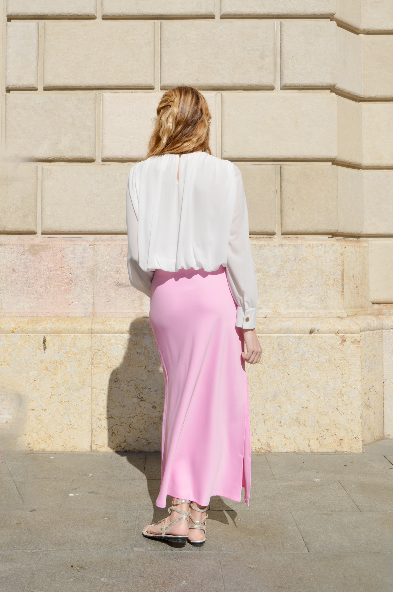 Blusa de manga larga y cierre en el puño. Corte hasta la cintura, con forro interior unido en la terminación para crear el efecto abullonado. Botón en la nuca para ceñir el escote al cuello.