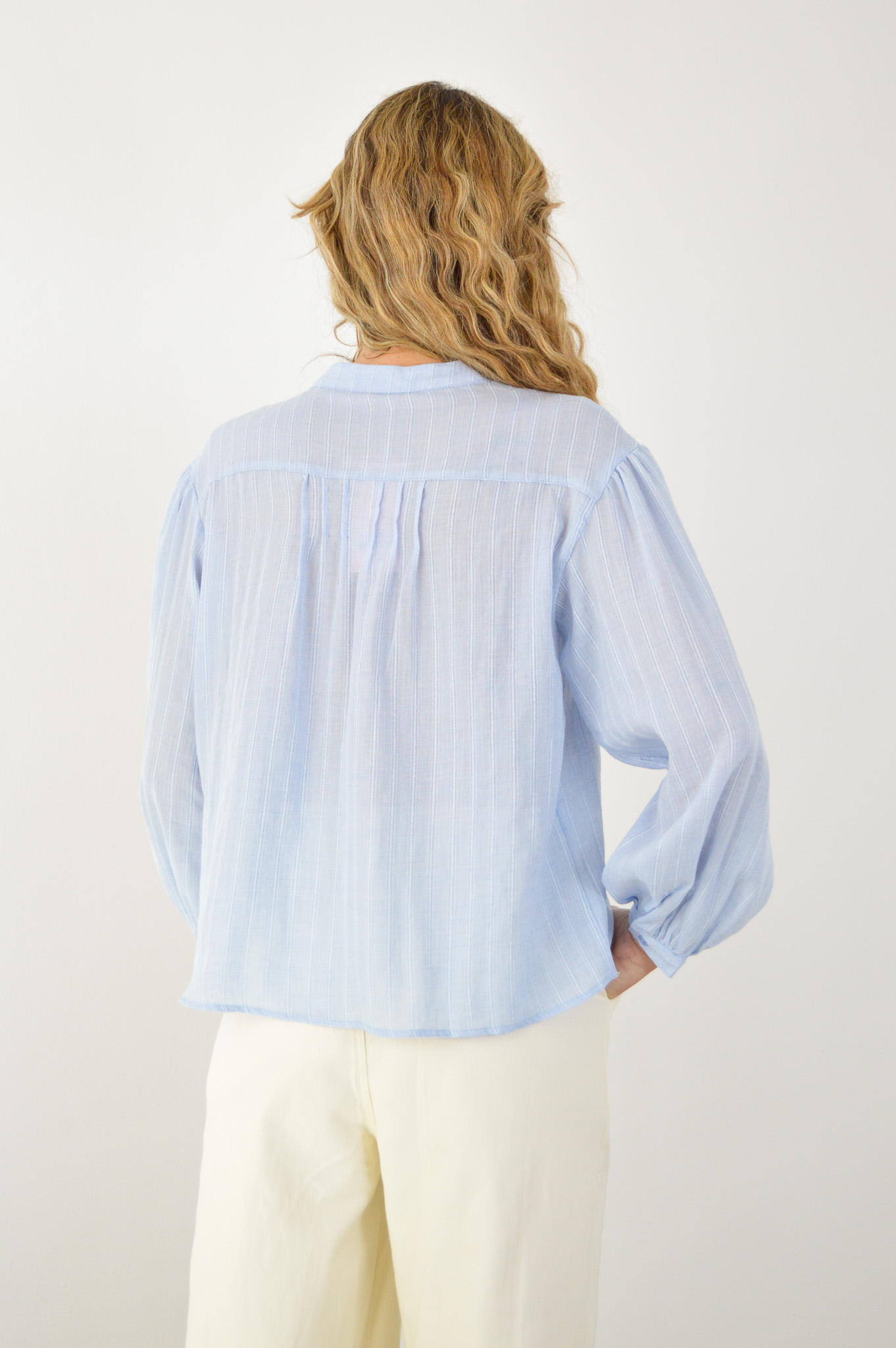 Blusa ancha de manga larga, cuello mao, con botones en torso y puños, de color azul cielo. Cuenta con unos detalles en relieve.