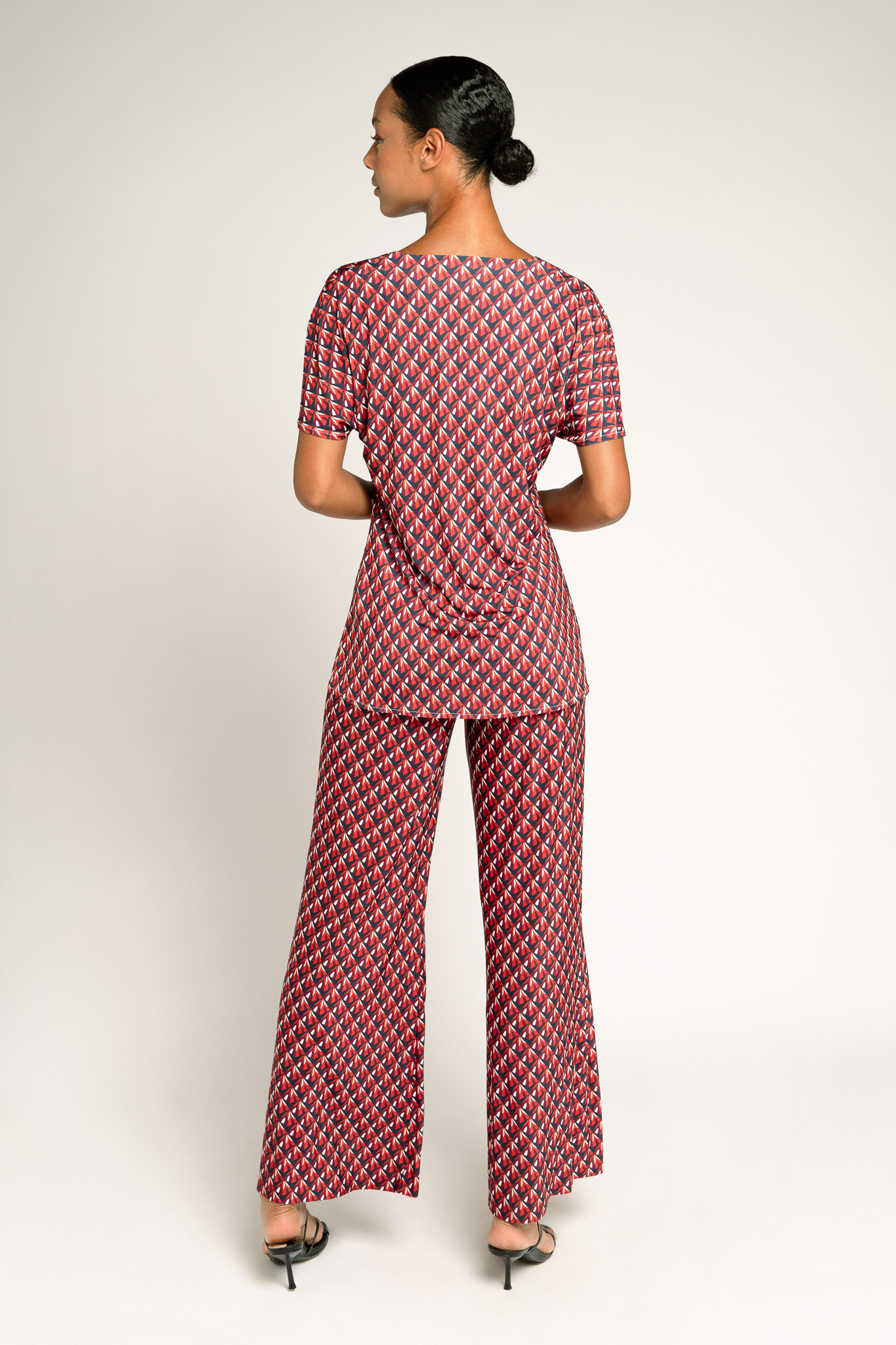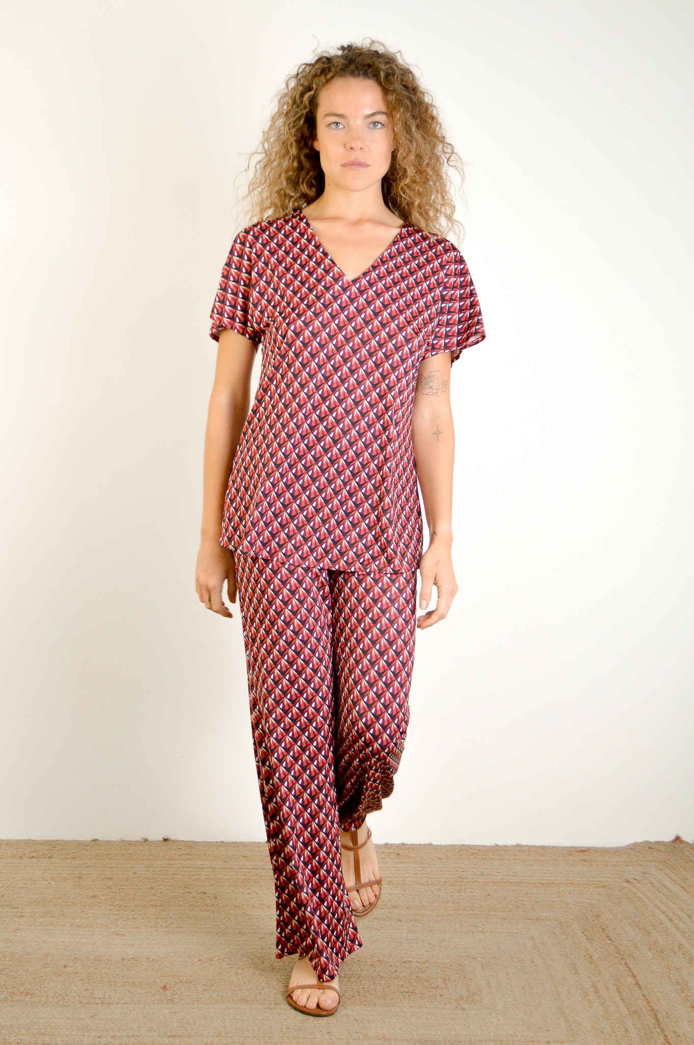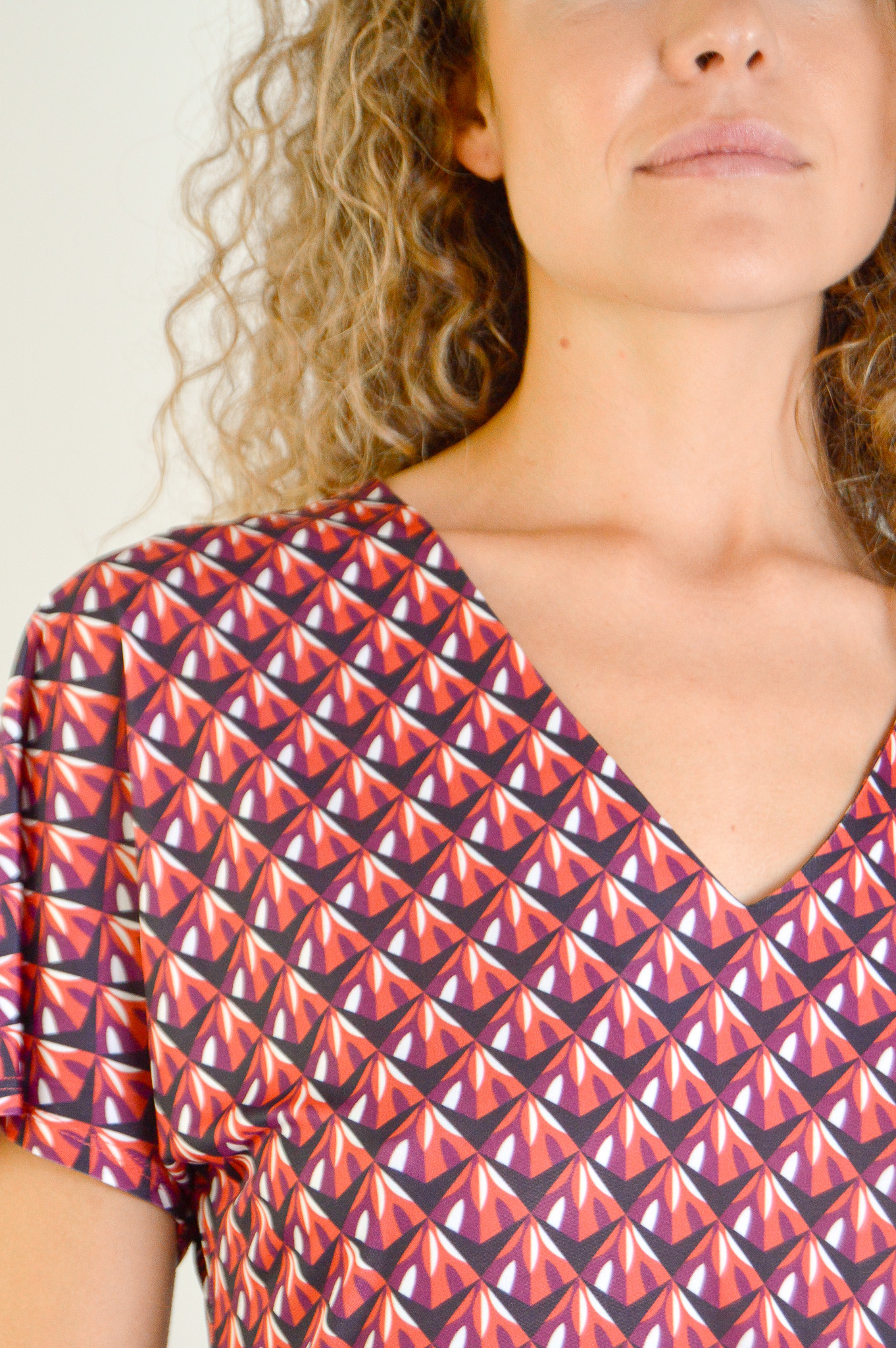 Camiseta de manga corta. Cuello pronunciado en forma de V con hombro bajo hasta el codo que genera una manga abierta en la zona de la cintura. Corte hasta la cadera.