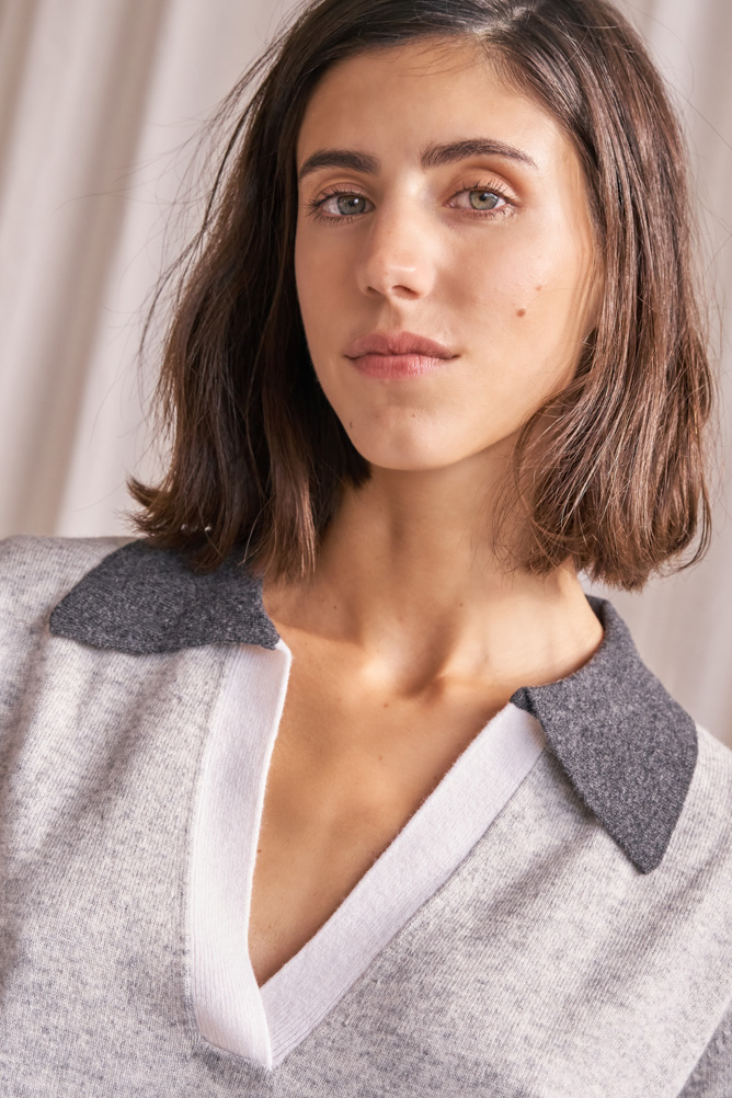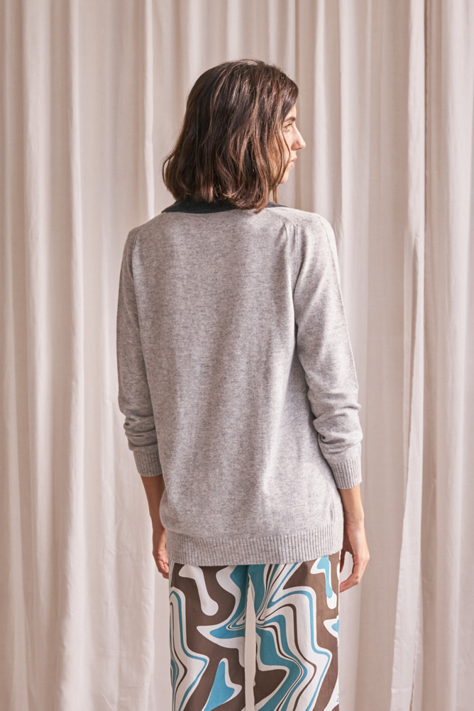 Jersey gris de cashmere estilo oversize con escote de pico con terminaciones en puños y cintura en canalé. Cuenta con un ribete a contraste en el cuello de color blanco y gris oscuro.
