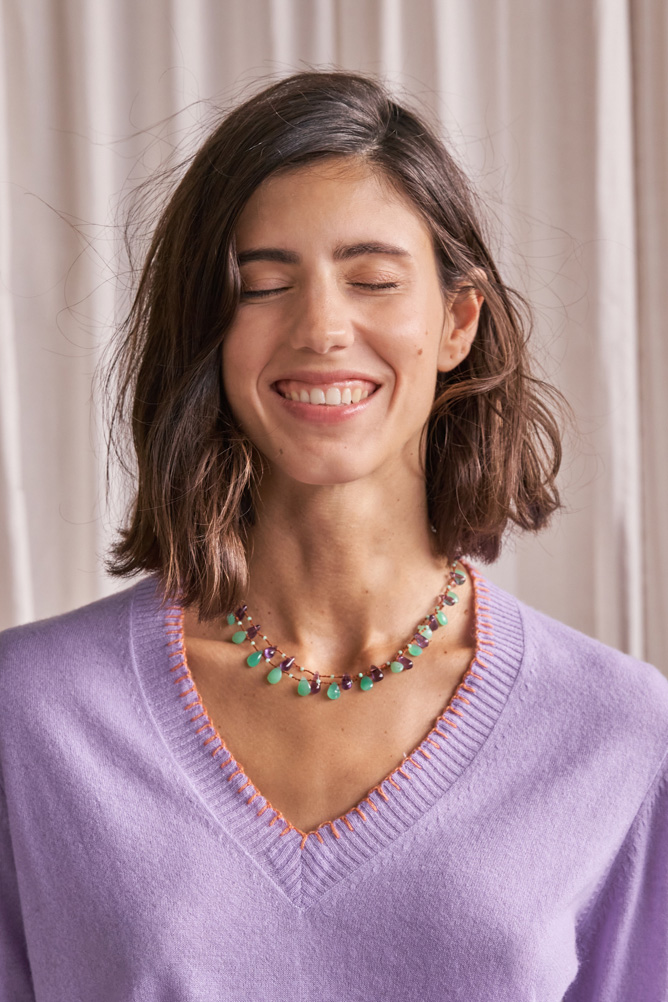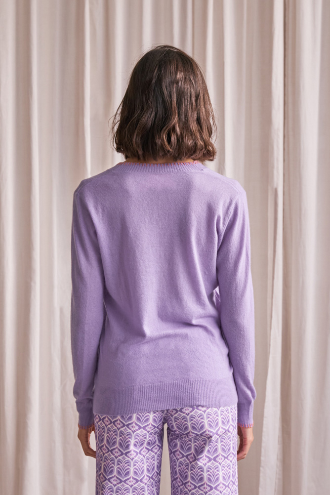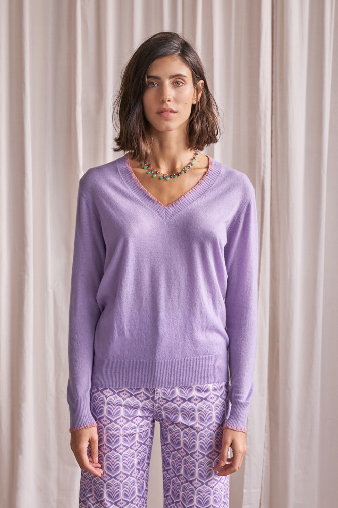 Jersey malva de cashmere con escote de pico con terminaciones en puños, cuello y cintura en canalé. Cuenta con un ribete a contraste en color naranja en cuello y puños.