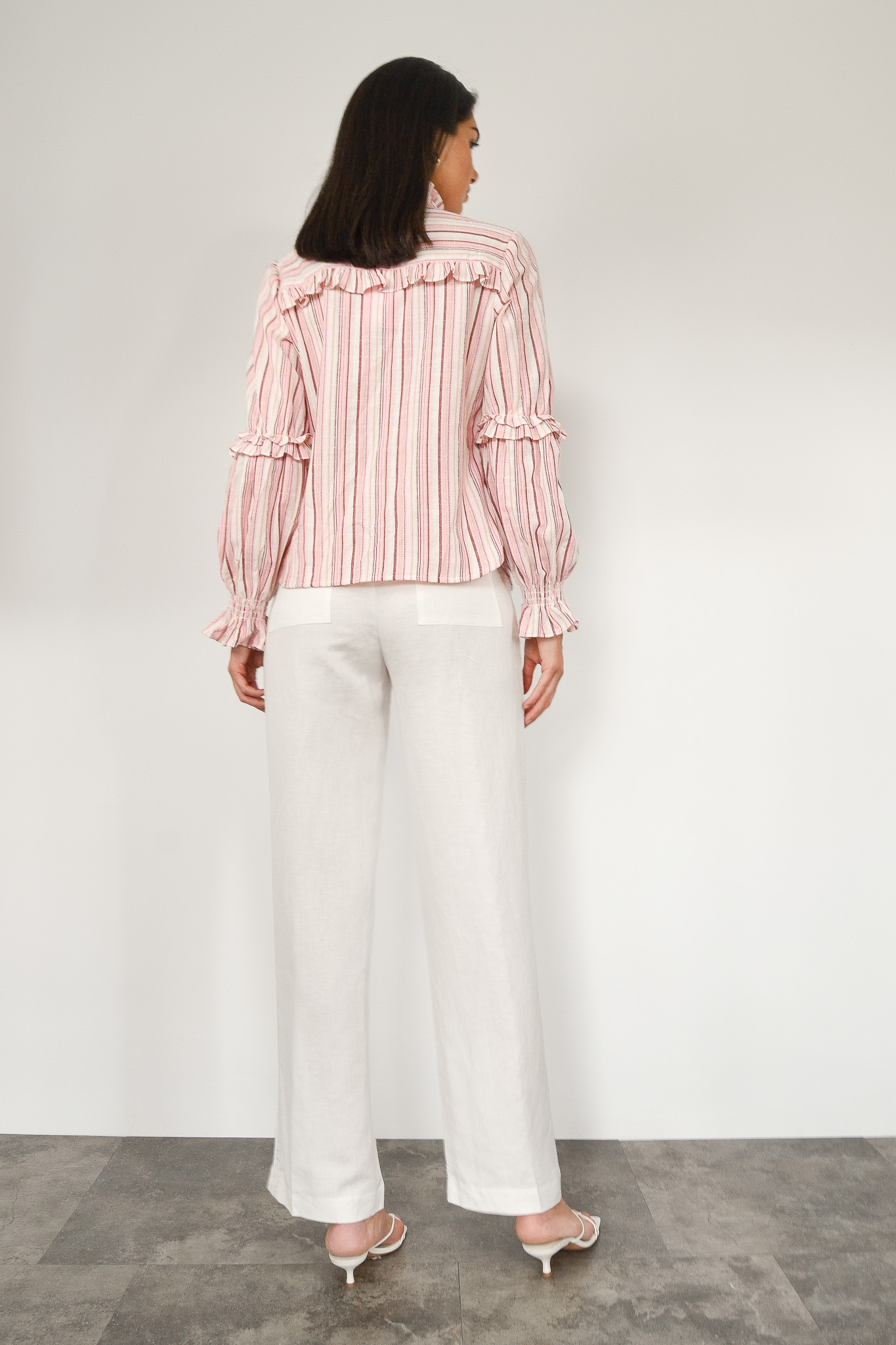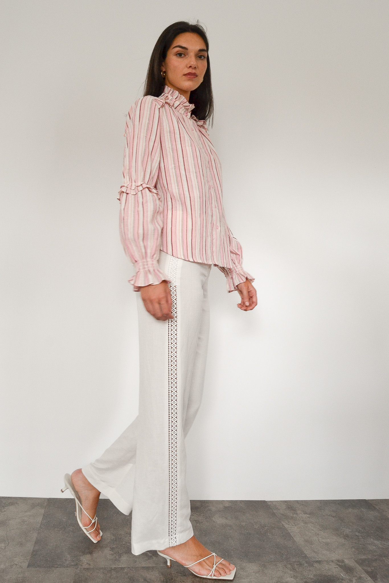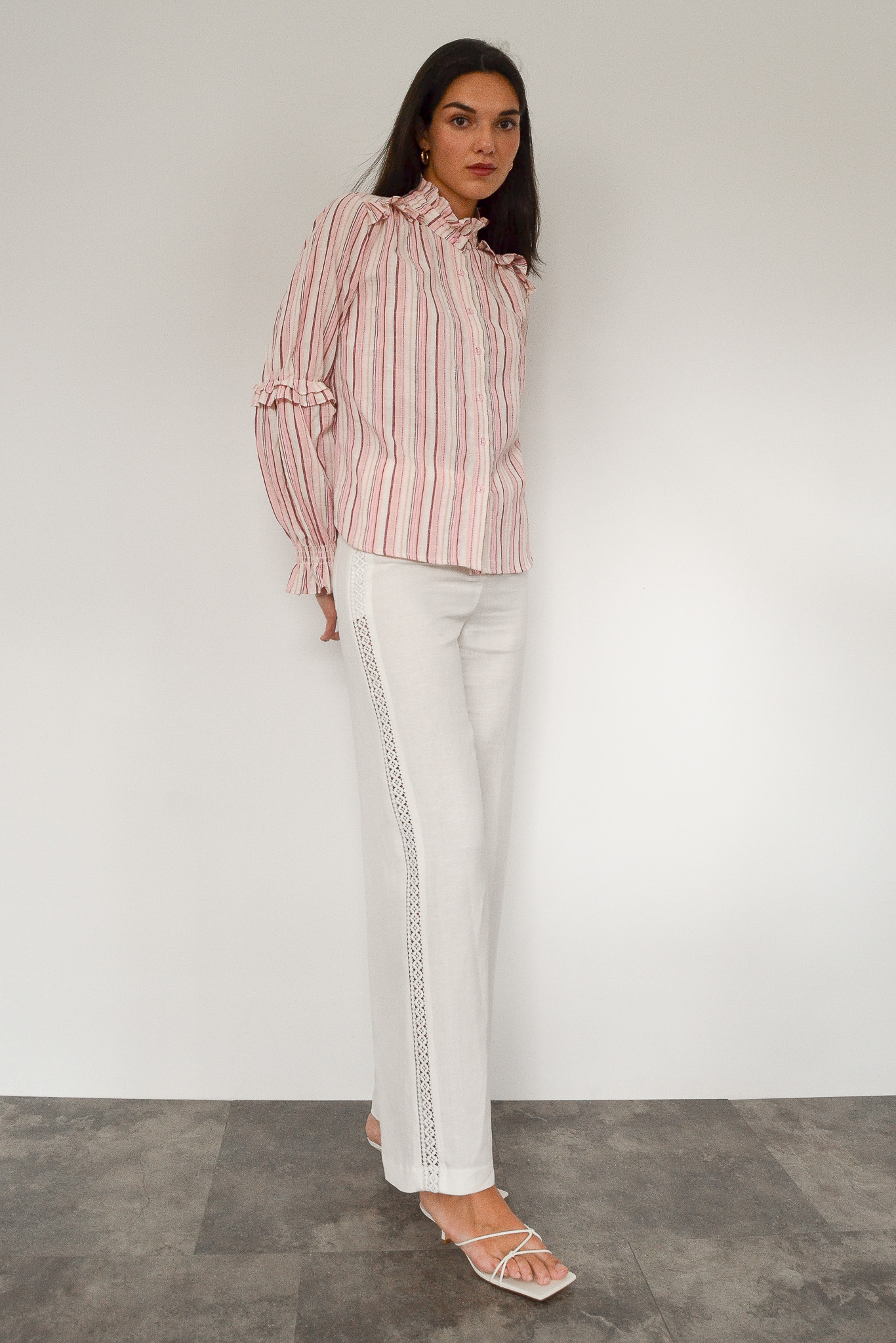 Pantalón largo recto. Cierre con botón y cremallera. Tejido calado desde el tiro hasta el bajo en el lateral exterior de cada pierna de 5 centímetros. Sin bolsillos.