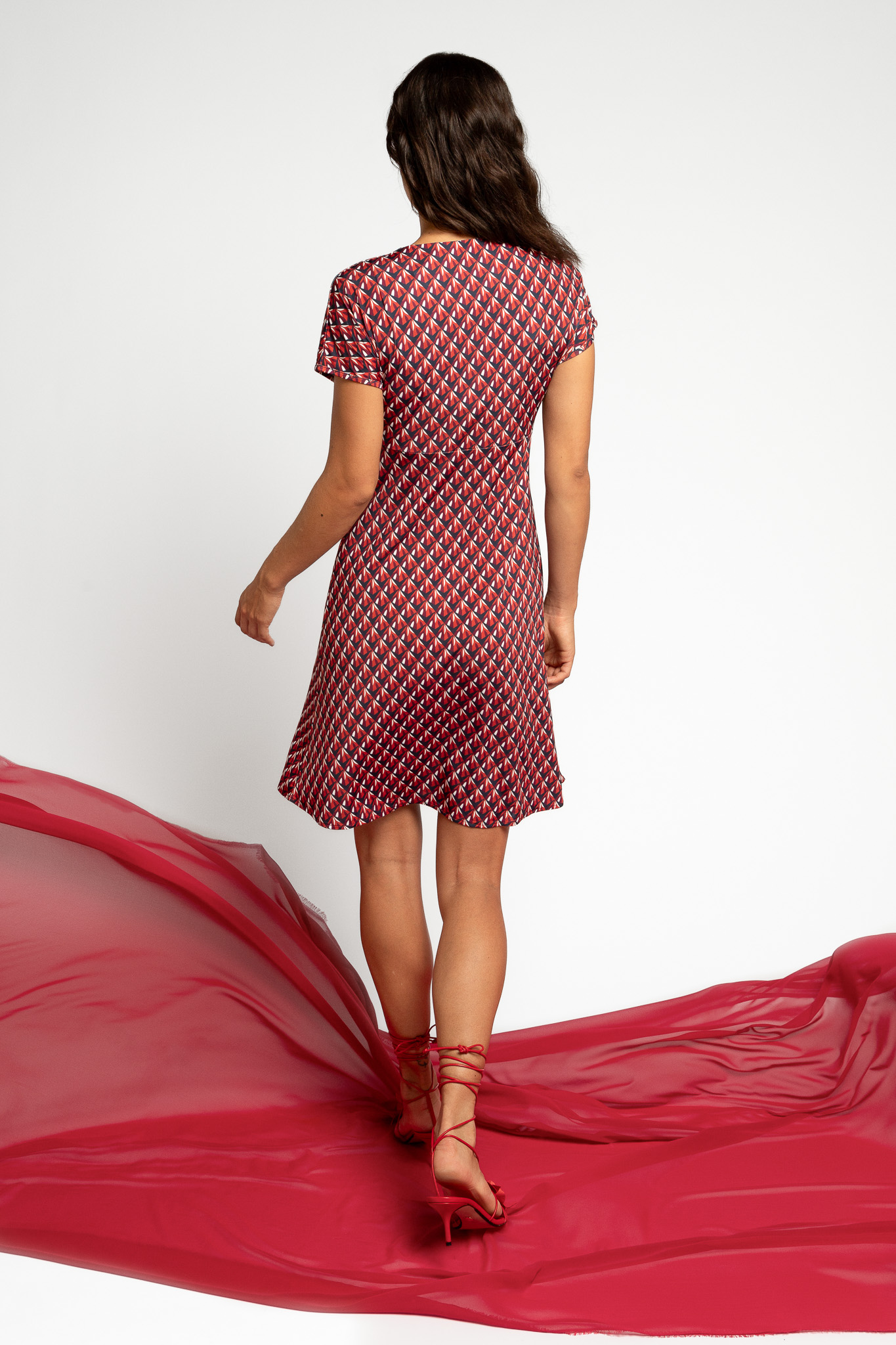 Vestido corto con nudo. Escote en V y manga corta. Nudo en la zona del vientre que estiliza la cintura. Falda con caída recta.