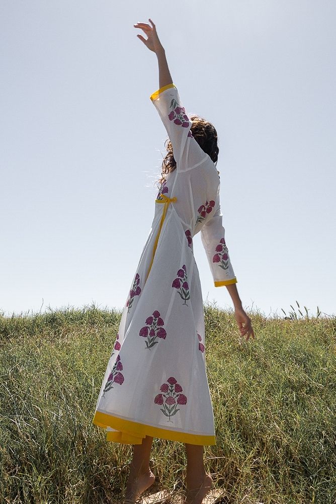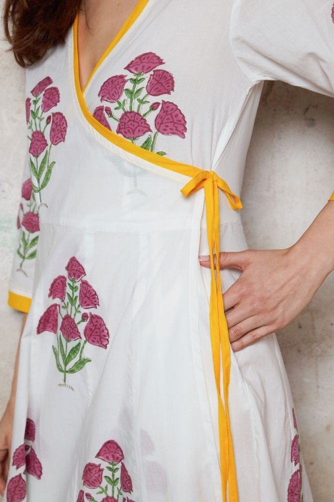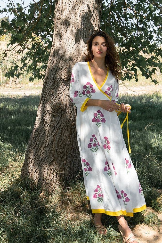 Vestido midi de manga larga. Escote pronunciado y cruzado, generado por el cierre lateral con lazo. Manga larga y acabada con un ribete a conjunto del lazo que abrocha el vestido. Tejido de algodón 100% con estampados hechos a mano en la India.