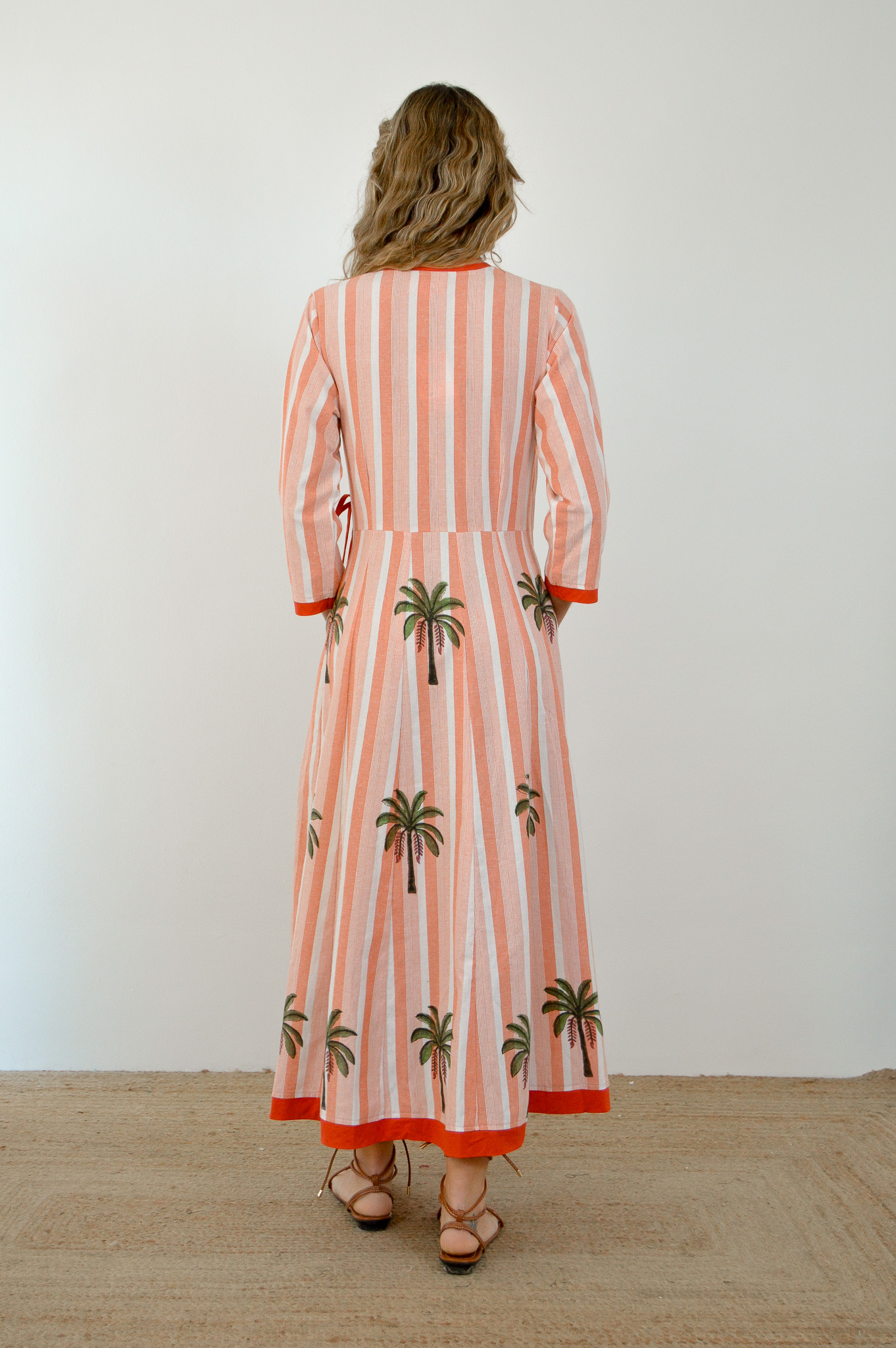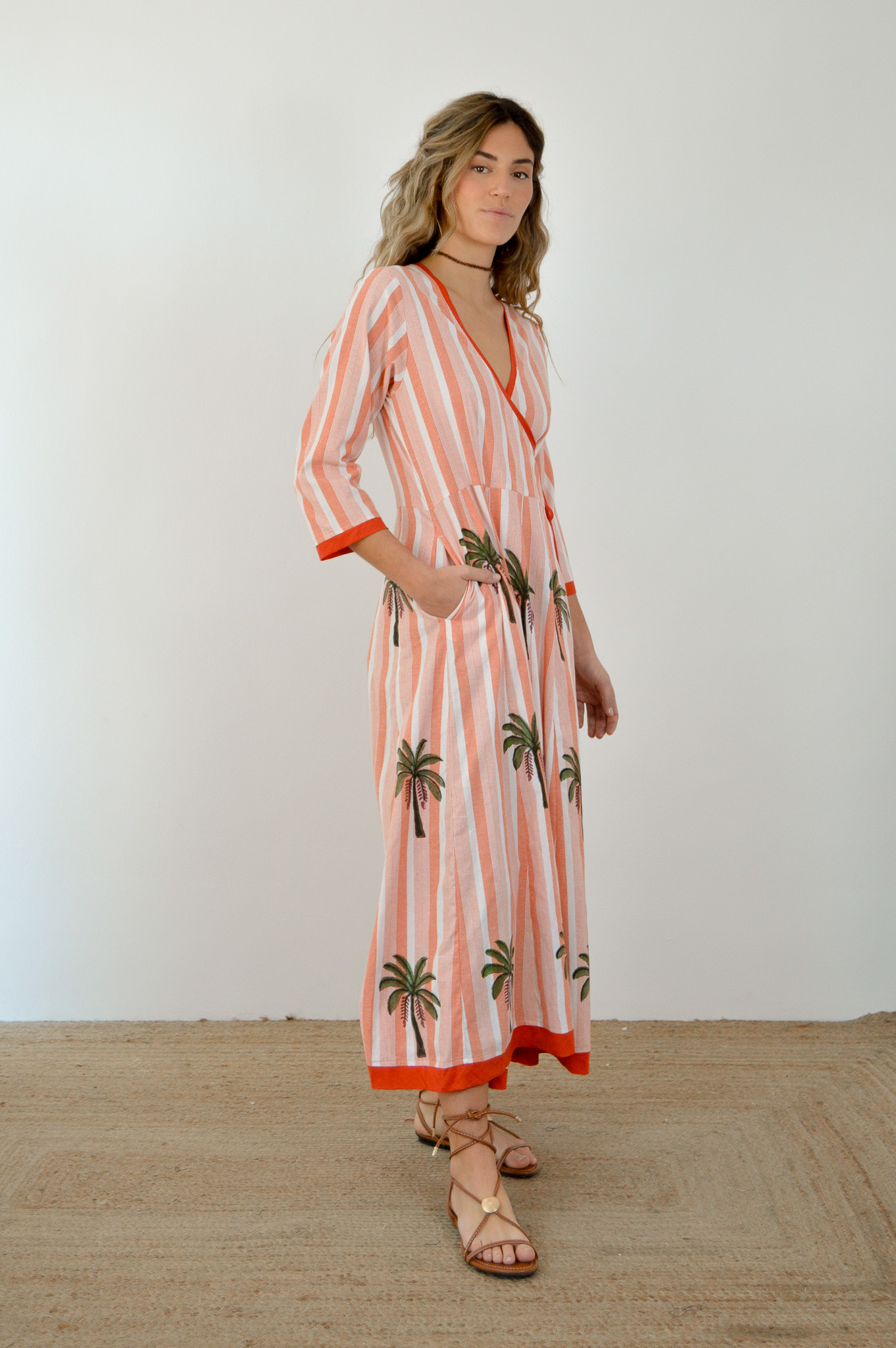 Vestido midi de manga larga. Escote pronunciado y cruzado, generado por el cierre lateral con lazo. Manga larga y acabada con un ribete a conjunto del lazo que abrocha el vestido. Tejido de algodón 100% con estampados hechos a mano en la India.
